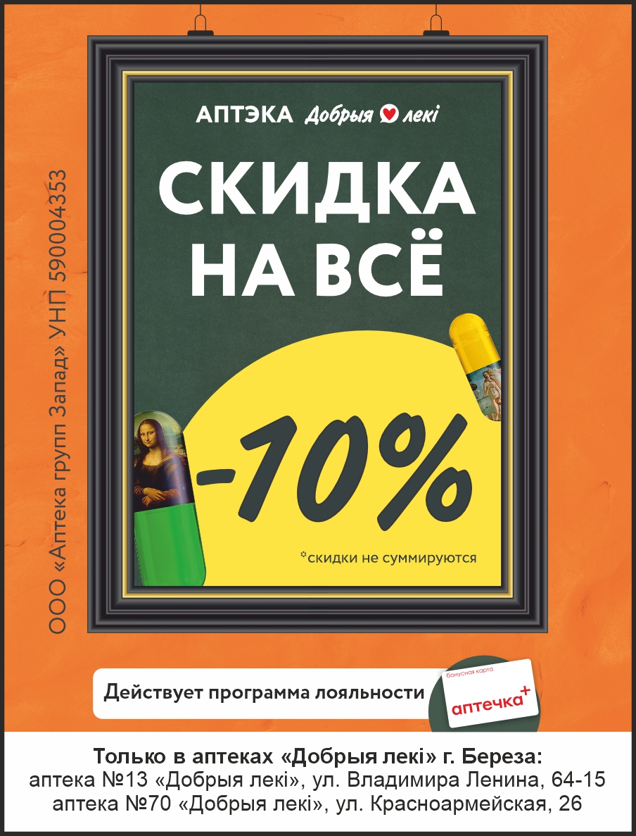 С 15 августа по 30 сентября в аптеках «Добрыя лекi» в Березе действует скидка 10% на весь ассортимент.