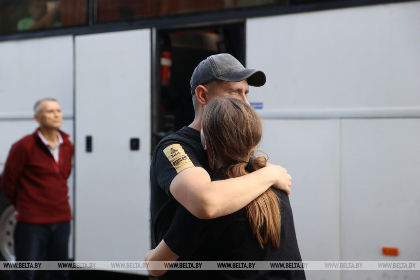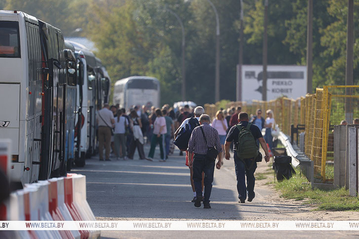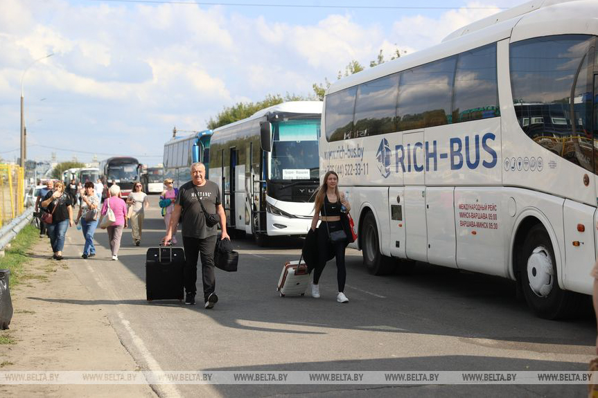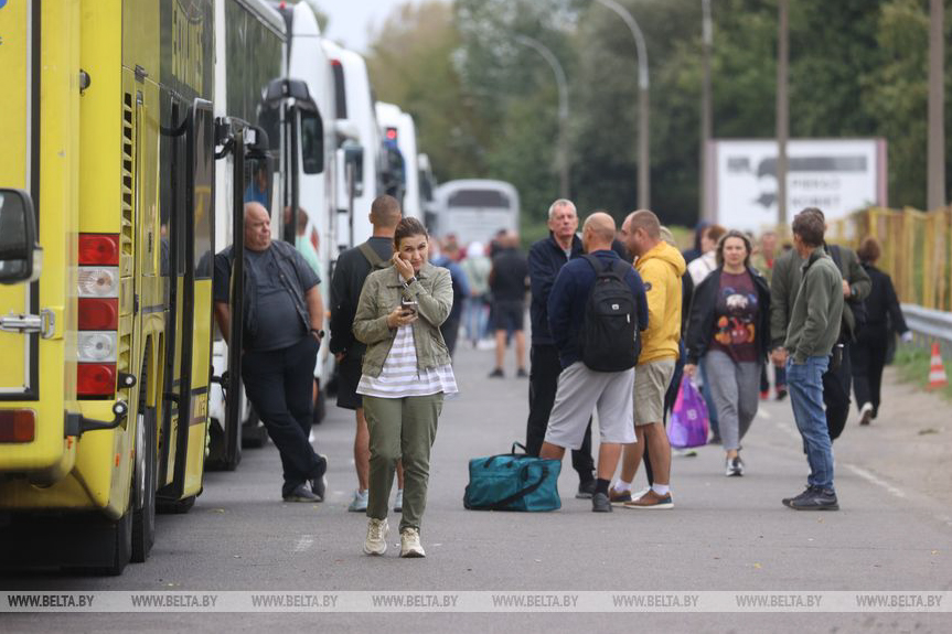 В очереди – автомобили и автобусы на номерах с регистрацией разных регионов Беларуси. Стоят в том числе авто с регистрацией PL. Навьюченные сумками и чемоданами люди ищут свободные места в автобусах и машинах. «Не хочется развернуться и домой поехать», – заметила на ходу какая-то девушка.