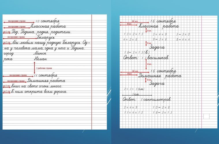В частности, для тетрадей в линейку предусмотрено расположение даты и фраз «Классная работа», «Домашняя работа» посередине строки, а начало абзацев – с отступом до 2 см. В тетрадях в клетку же установлены более строгие правила: дата должна располагаться с отступом в десять клеток от левого края листа, а «Классная работа» и «Домашняя работа» – с отступом в шесть клеток. Также определены нормы отступов между различными видами работ: четыре клетки или две рабочие строки.