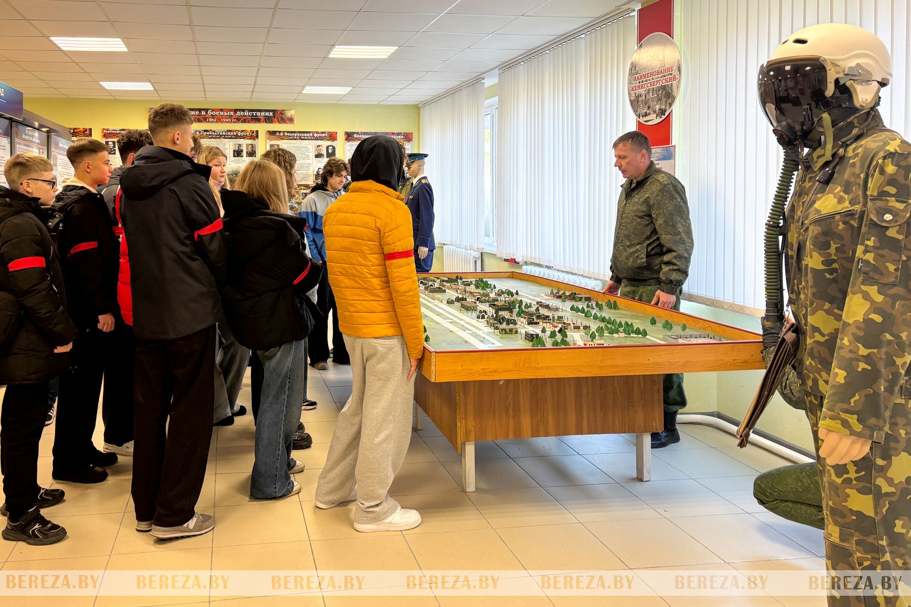 Первым делом мальчишки и девчонки вместе со своими педагогами отправились в комнату боевой славы воинской части. Заместитель начальника центра Александр Быков провел для них экскурсию, рассказал об истории части, о героях, известных авиаторах-земляках, прославивших Березовщину.