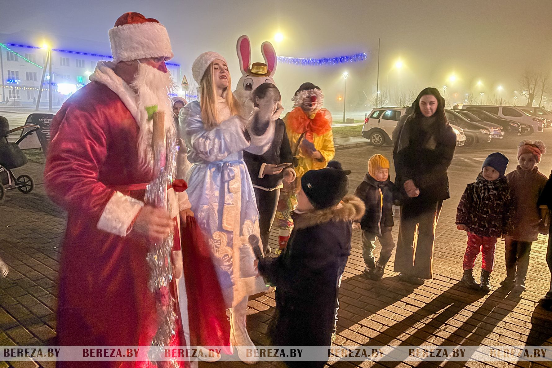Первая остановка праздничного автобуса, украшенного гирляндами и фонариками, была у магазина «Евроопт» на ул. Владимира Ленина. Заметив сверкающий транспорт, из которого доносились новогодние тренды, березовчане спешили на представление. Артисты, прибывшие «Новогодним экспрессом», устроили настоящее шоу. Маша, Медведь, Крокодил, веселые клоуны, символ наступающего 2026 года – игривая лошадка – пели, плясали и веселились с ребятами.