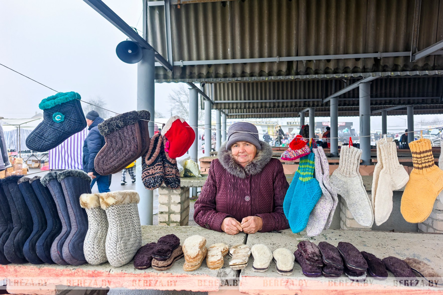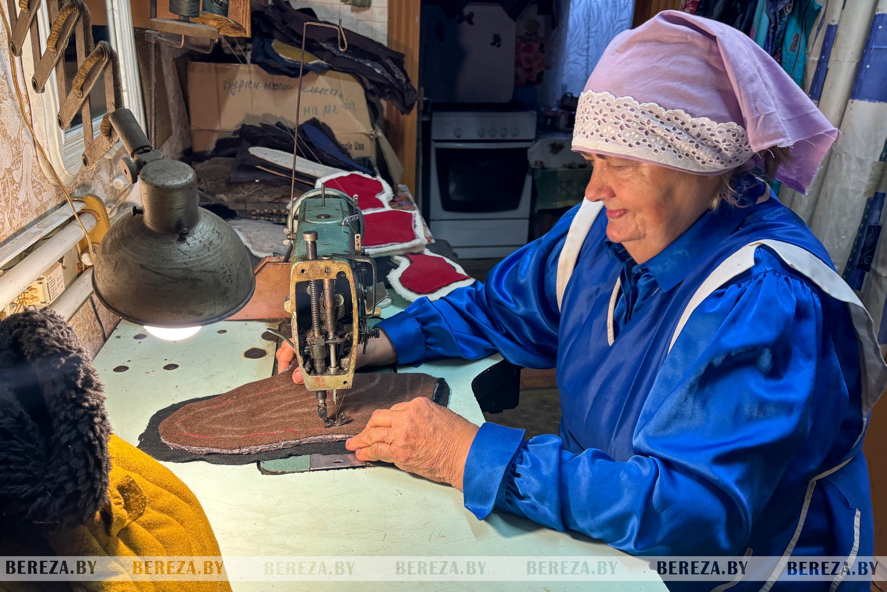 Рассказываю Марии Антоновне, что видела ее изделия – так называемые бурки – сапожки из войлока, ватины, сукна наподобие валенок, вязаные носки, пинетки, меховые стельки – в ролике при обзоре березовского рынка в TikTok. «На протяжении многих лет езжу со своей продукцией на рынок в Березу. Популярностью пользуются бурки. Заказывают мужские, женские, детские. Каждому изделию стараюсь уделить внимание, для женщин и детей придумываю «веселые» бурки с аксессуарами. Я без рынка уже никак. Там своя атмосфера: торгуем, общаемся», – делится моя собеседница.
