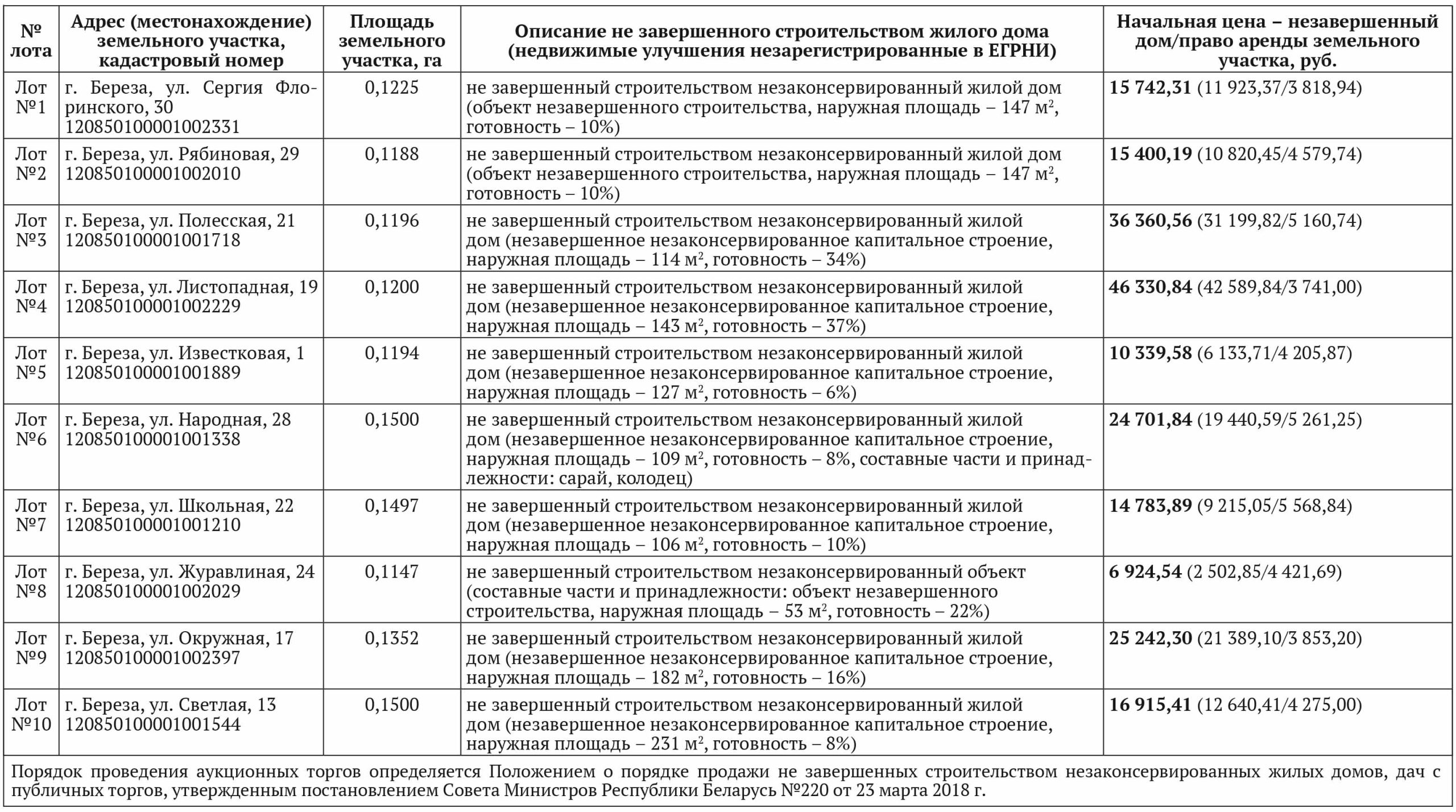 23 декабря в 11.00 по адресу: г. Береза, ул. Владимира Ленина, 104а-1, третий этаж, каб. 310, состоится повторный аукцион по продаже не завершенных строительством незаконсервированных жилых домов и права аренды земельных участков, необходимых для их обслуживания, в г. Березе.