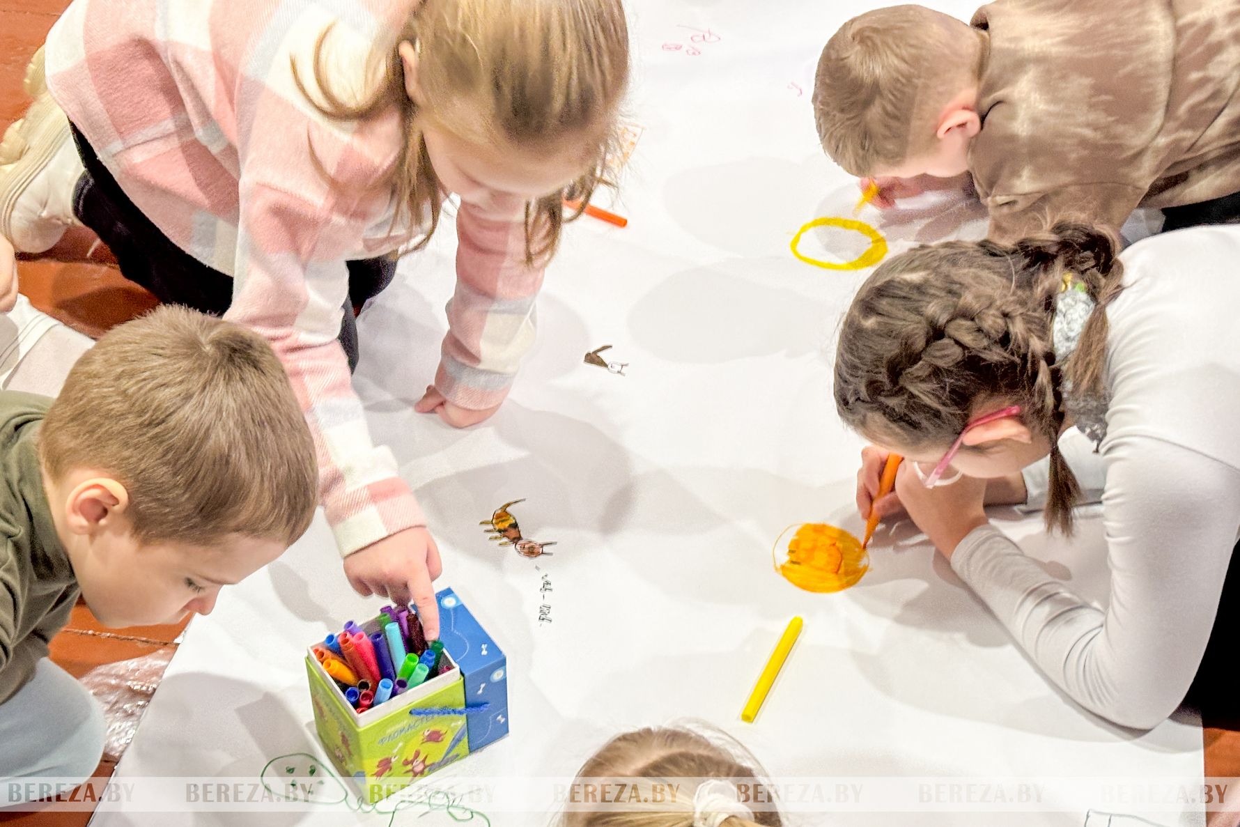 Самым креативным этапом мероприятия стал совместный рисунок – на огромном листе бумаги ребята нарисовали «Свой счастливый Новый год». Радостно, что рисунок совмещал солнце, цветы, зверей, улыбающихся людей, много игрушек. Это значит, что таким ярким и красочным видят мир наши дети.